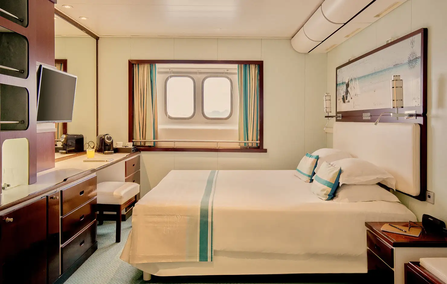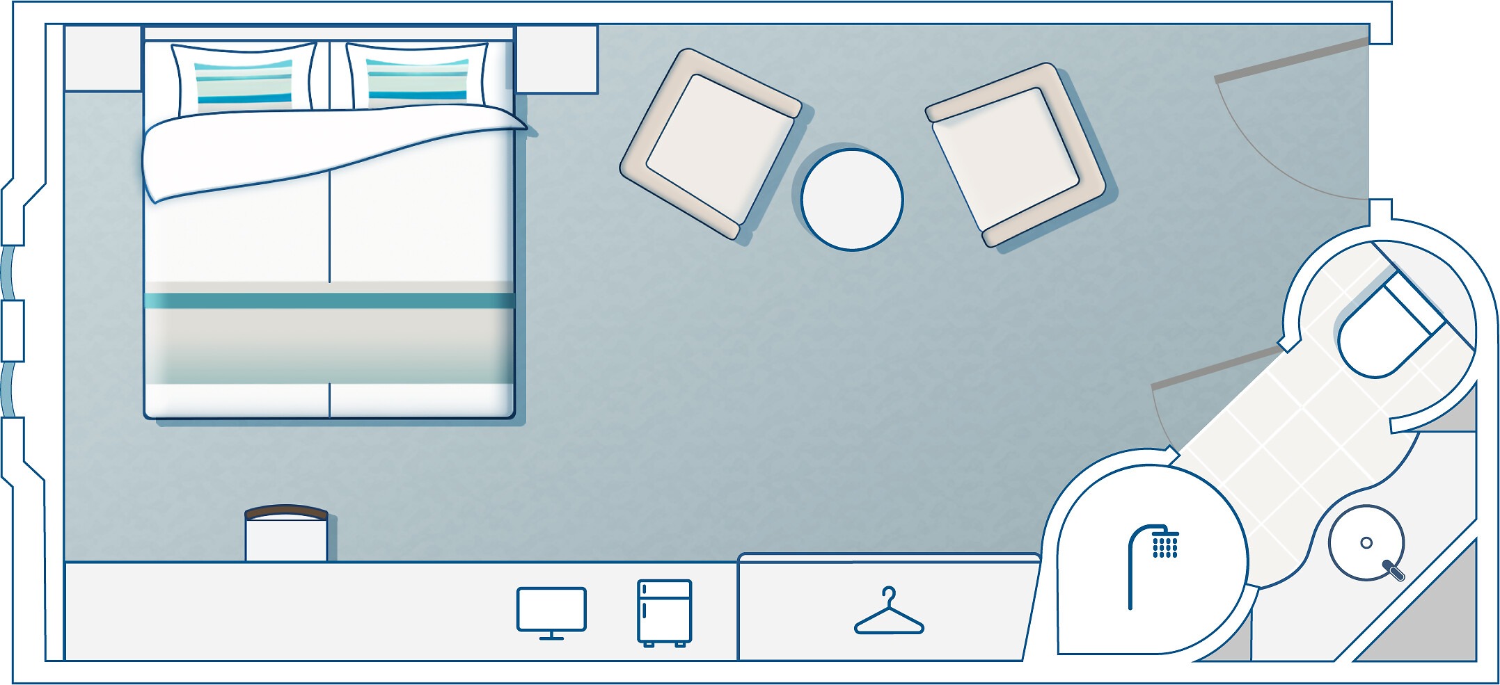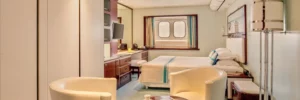 Su Fiji, il ponte più prestigioso in assoluto, la vostra cabina Deluxe ha due oblò verso l'esterno. Godetevi lo spazio extra e l’arredamento in stile, ispirato alle onde azzurre dell’oceano che si frangono sotto di voi.