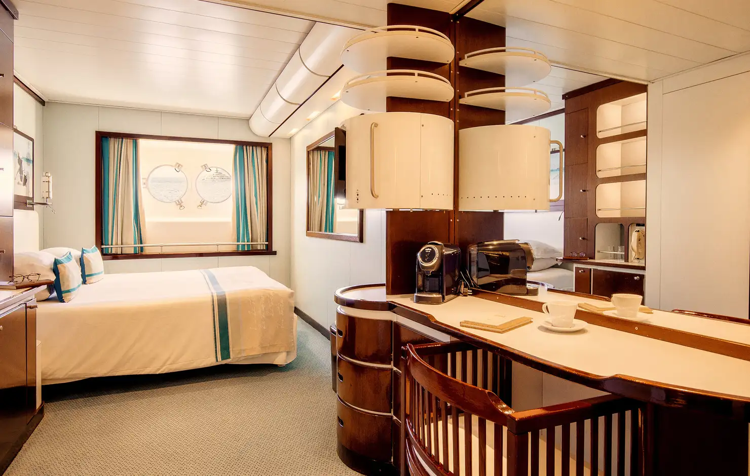 Queste due cabine sul ponte più basso, Borneo, sono comode ed eleganti. Il design in stile ricorda l’architettura navale con preziosi arredi in legno.