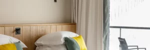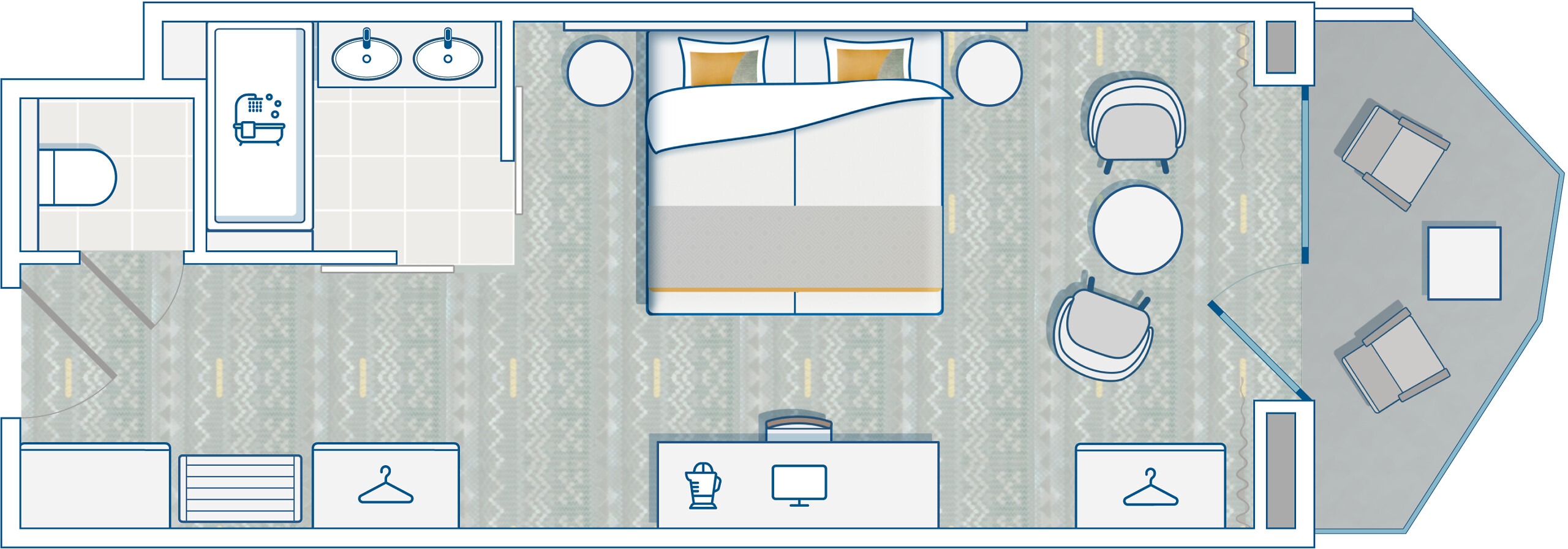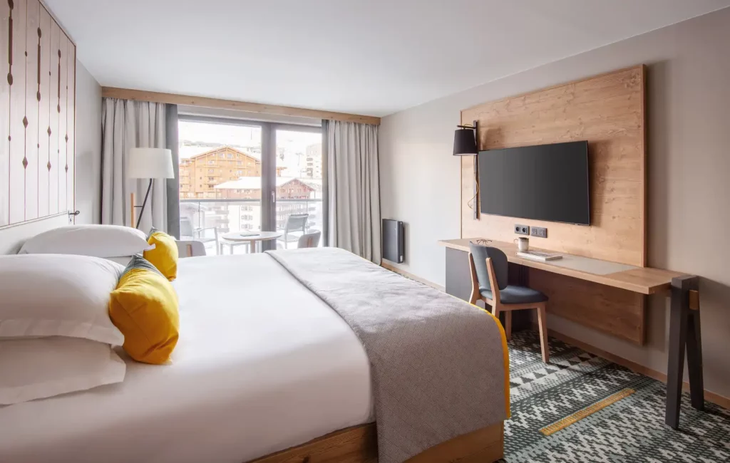 Il legno nudo, i toni del grigio e del giallo e i motivi creano un'armonia moderna e accogliente. Lo spazio è generoso e dispone di un'area salotto di fronte alle grandi finestre panoramiche e al balcone.