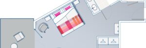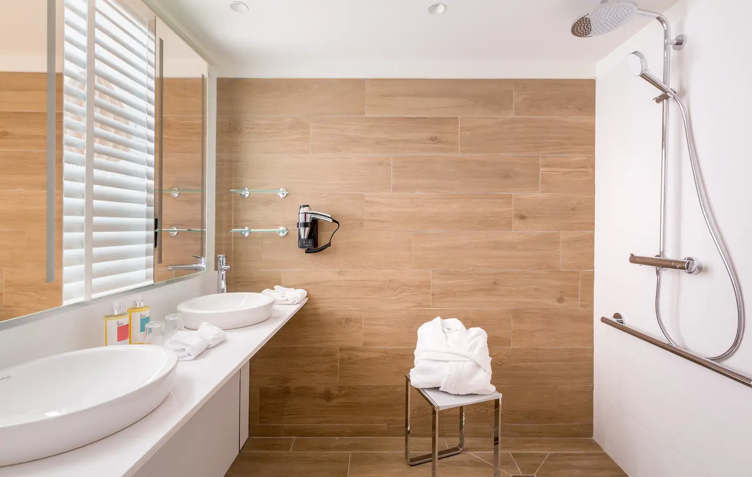 Camera di grandi dimensioni, studiata con diversi accorgimenti, compreso un impianto doccia accessibile alle persone con ridotta mobilità. Gli ascensori al piano collegano facilmente la camera al bar e al ristorante.