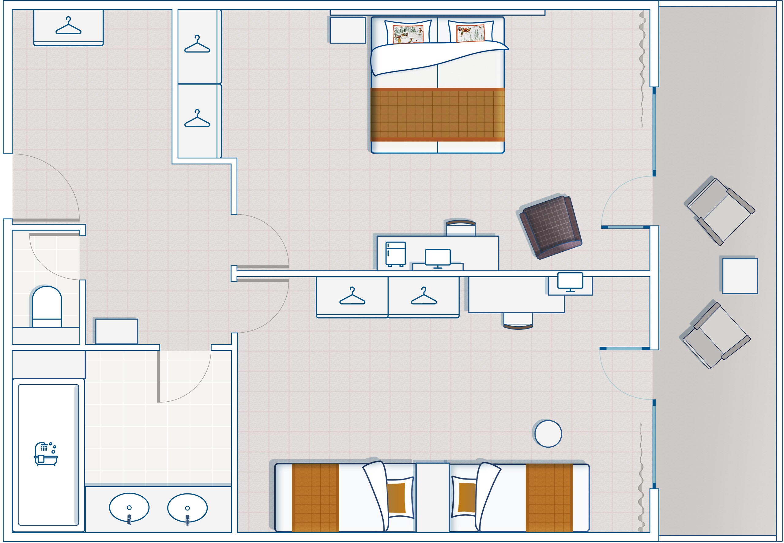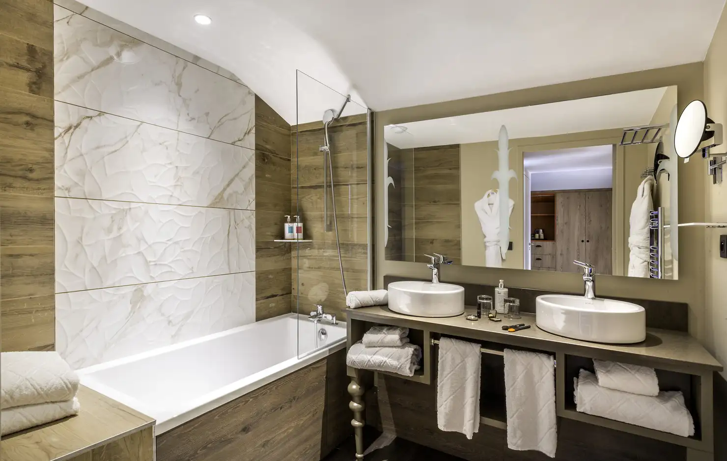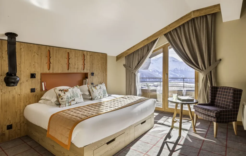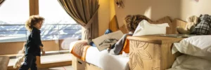Questa grande camera per famiglie offre il piacere di un ampio spazio abbinato a colori e materiali armoniosi. Dispone di un balcone, una zona lounge e due distinti spazi notturni per bambini e genitori. La camera si caratterizza anche per l'arredamento accogliente, tipico degli chalet di montagna.