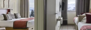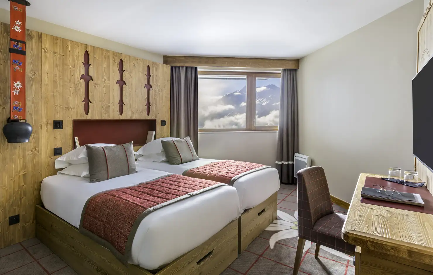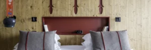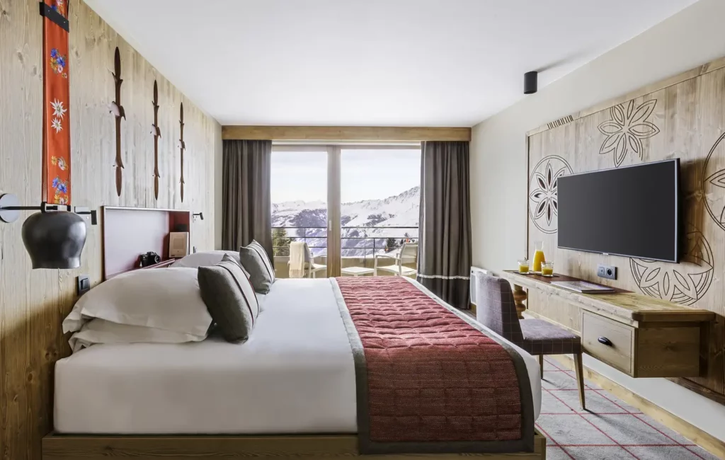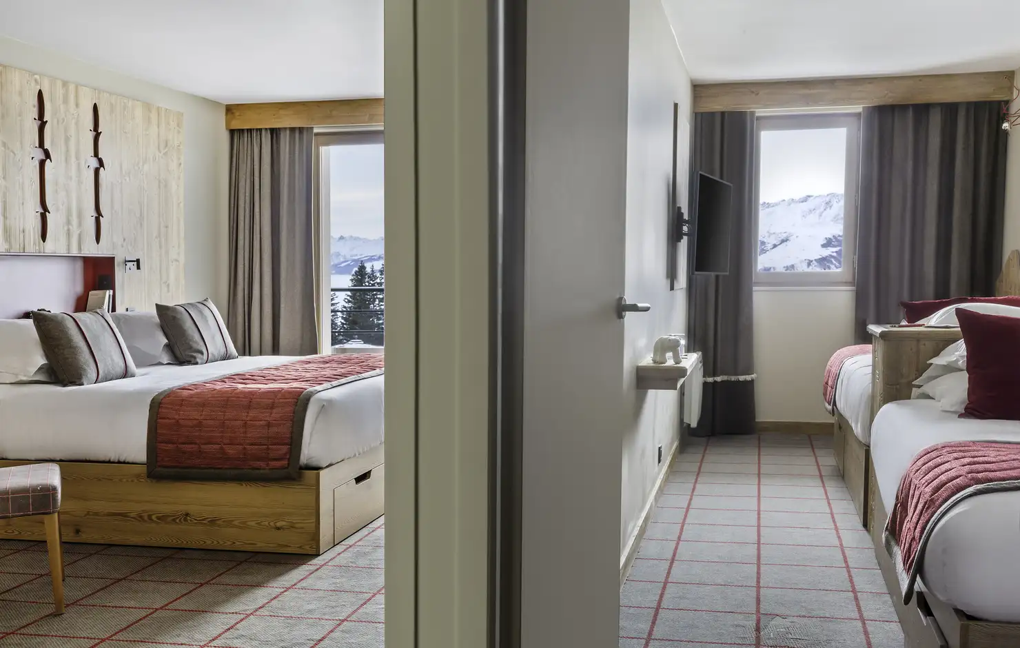 La camera è ideale per le famiglie ed è progettata con 2 spazi notturni separati, un bagno e un balcone arredato. La camera rende omaggio alla tradizione della montagna. Il legno, la campana e i motivi floreali tipici della Savoia, come la stella alpina, sono tutte caratteristiche tradizionali degli chalet alpini.