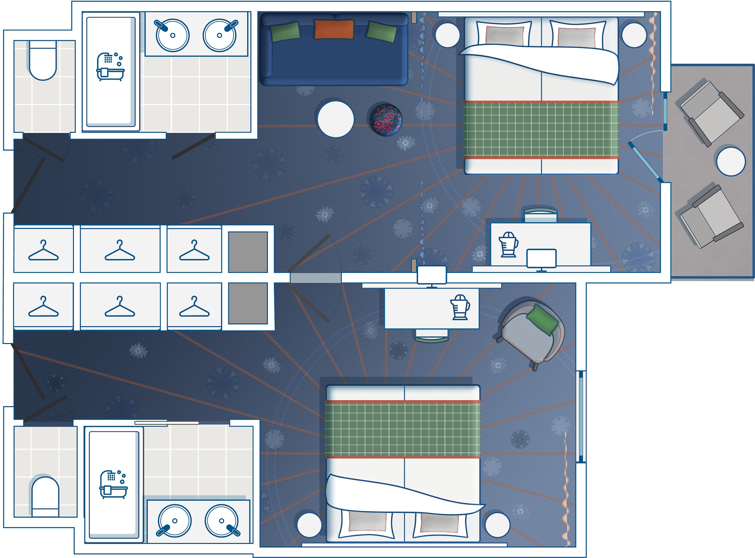 Queste camere comunicanti, calde e luminose, sono perfette per le famiglie: una camera per i genitori e una camera con balcone e 2 zone notte per i bambini.