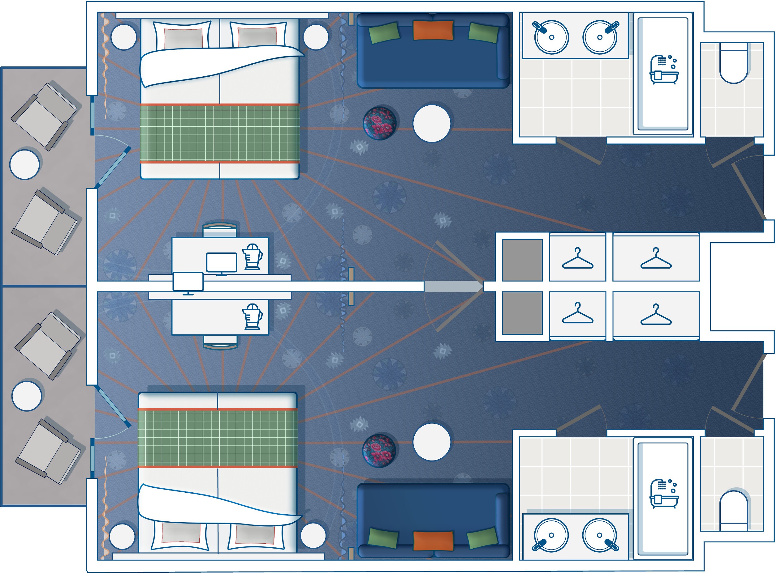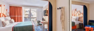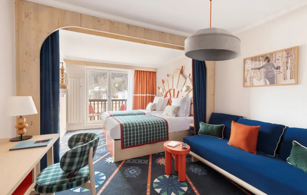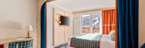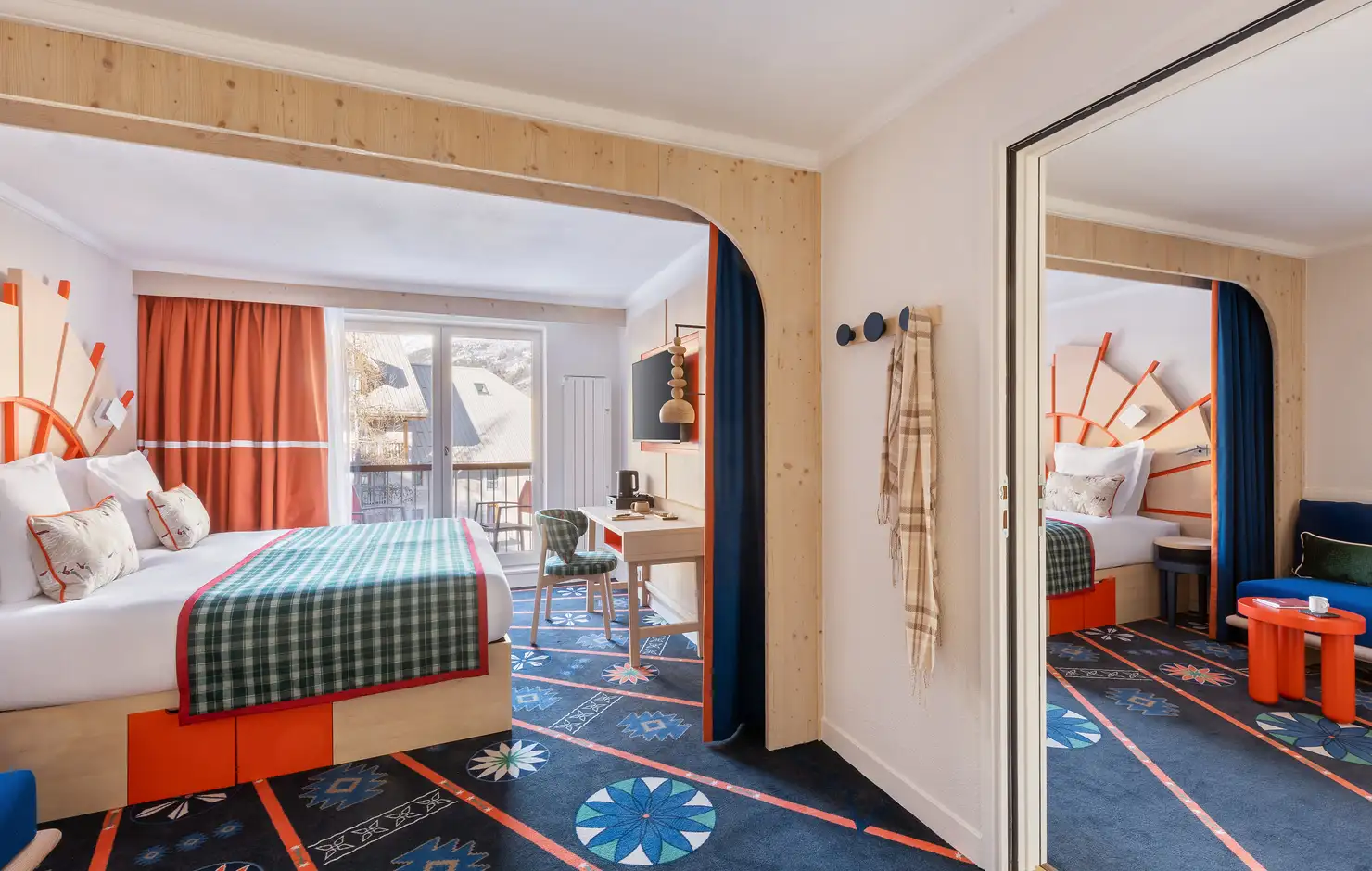 Le famiglie numerose apprezzano questa combinazione di camere con 2 balconi, 4 zone notte separate e 2 bagni. Il legno grezzo, le fantasie dei tappeti e i tartan jacquard presenti qua e là ci immergono nello spirito delle montagne.