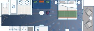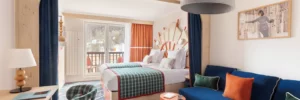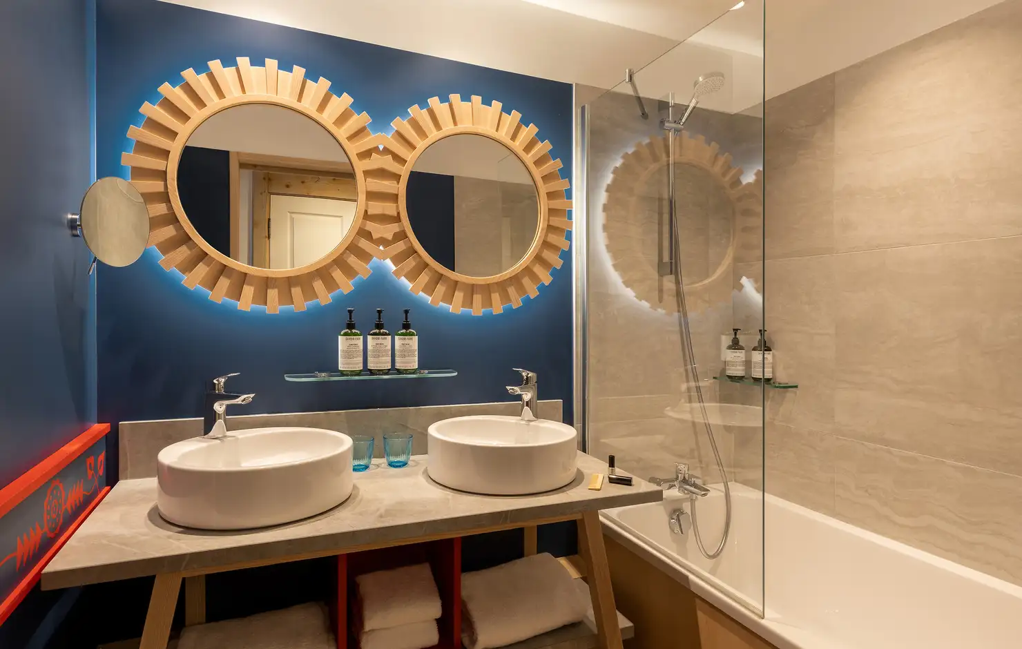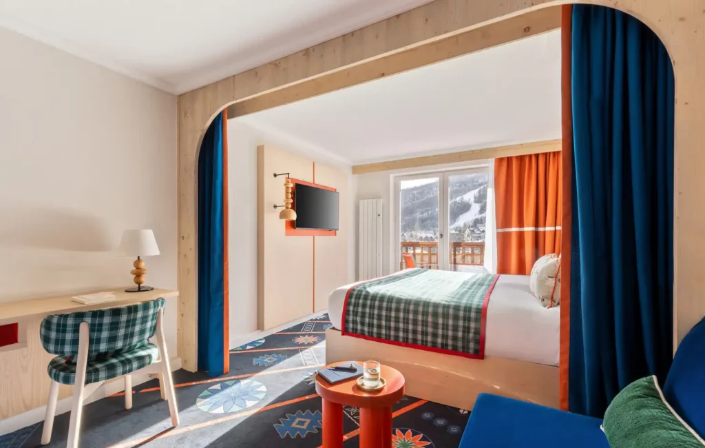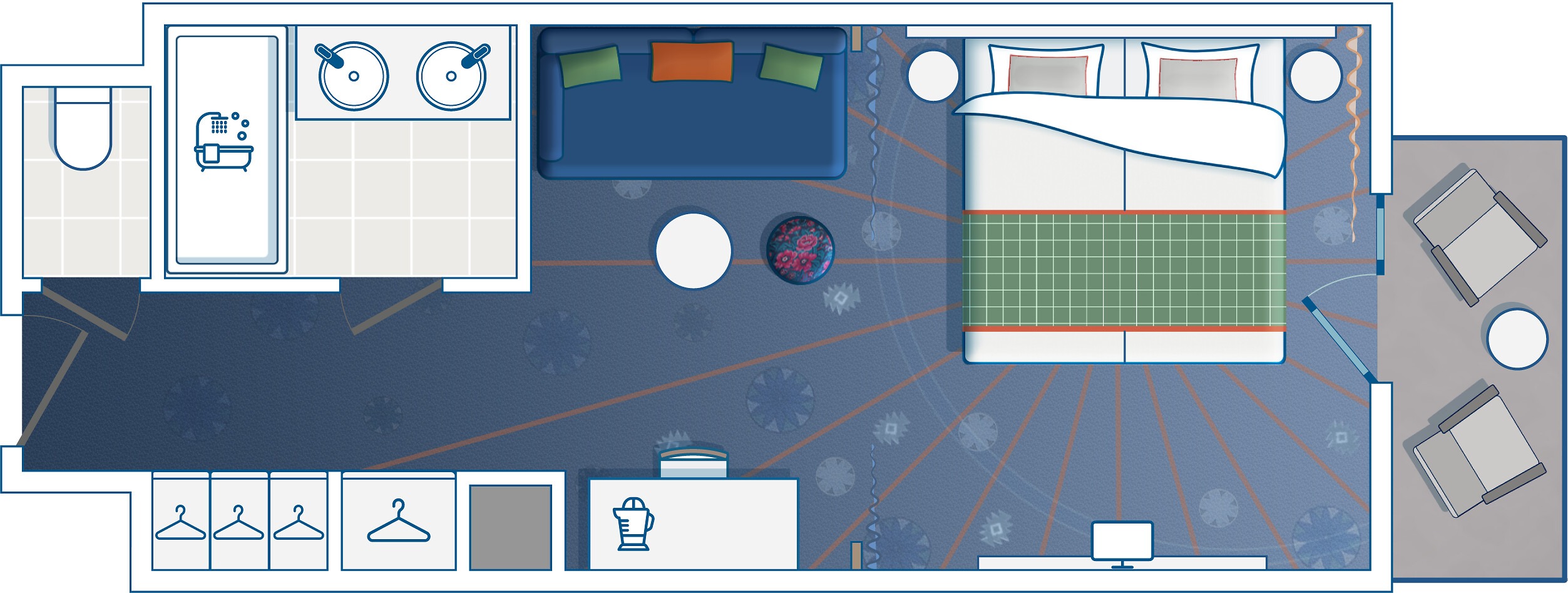 Questa camera luminosa, con il suo balcone soleggiato, è ideale per le famiglie con un bambino fino a 11 anni. Il bagno con vasca e la zona notte separata da una spessa tenda garantiscono comfort e privacy.