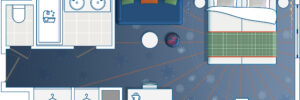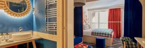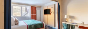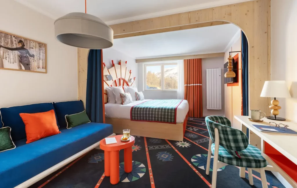 Le famiglie con bambini fino a 11 anni ameranno questa camera luminosa e colorata. La testata a forma di meridiana e gli oggetti in legno grezzo sono un vero e proprio invito alla montagna. Le zone notte sono separate da una spessa tenda.