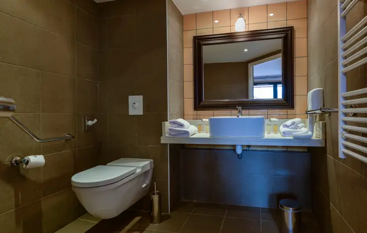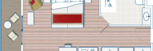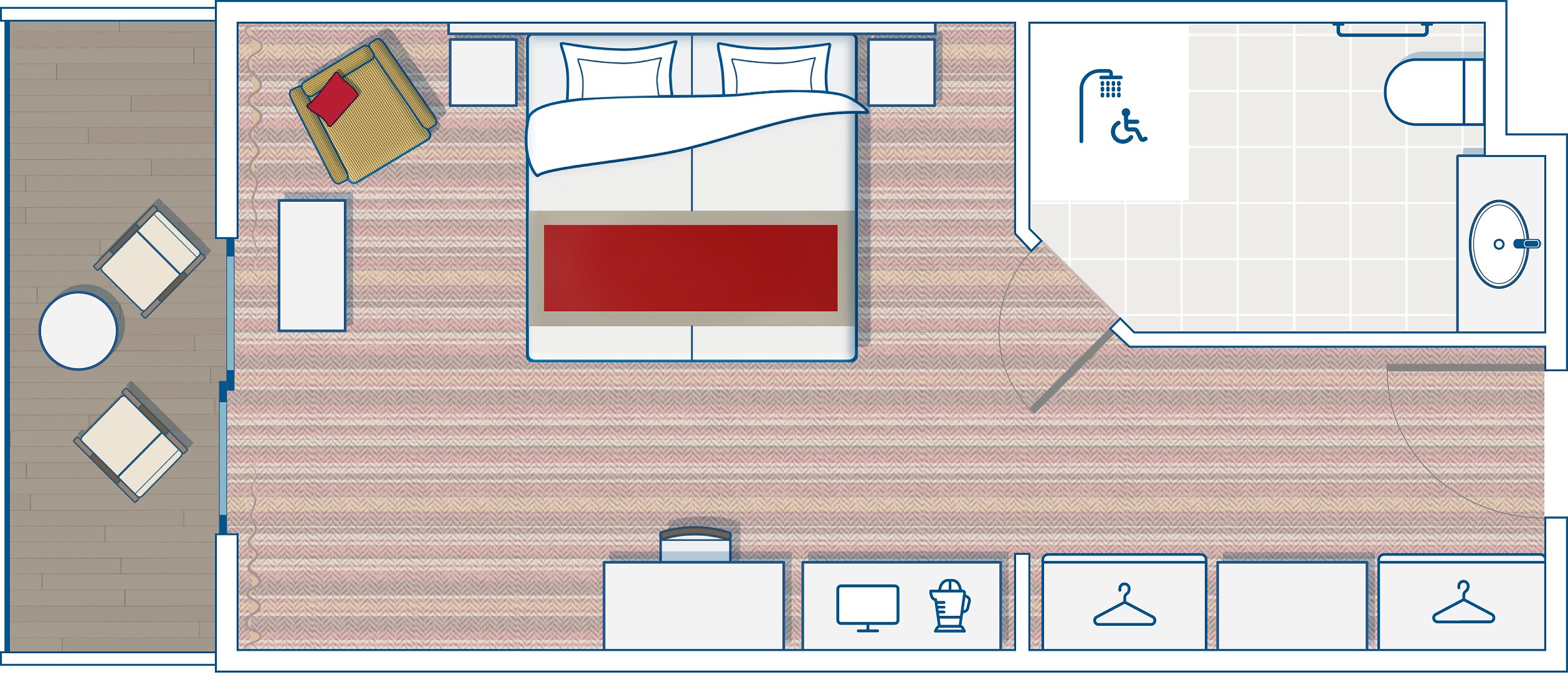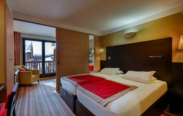 Disponibile dall'estate 2023. La camera, confortevole e spaziosa, è perfetta per le famiglie e adatta alle persone con mobilità ridotta. I mobili in legno e i toni di colore della decorazione aggiungono un tocco caldo e moderno. Ammirate la vista dal vostro balcone arredato.
