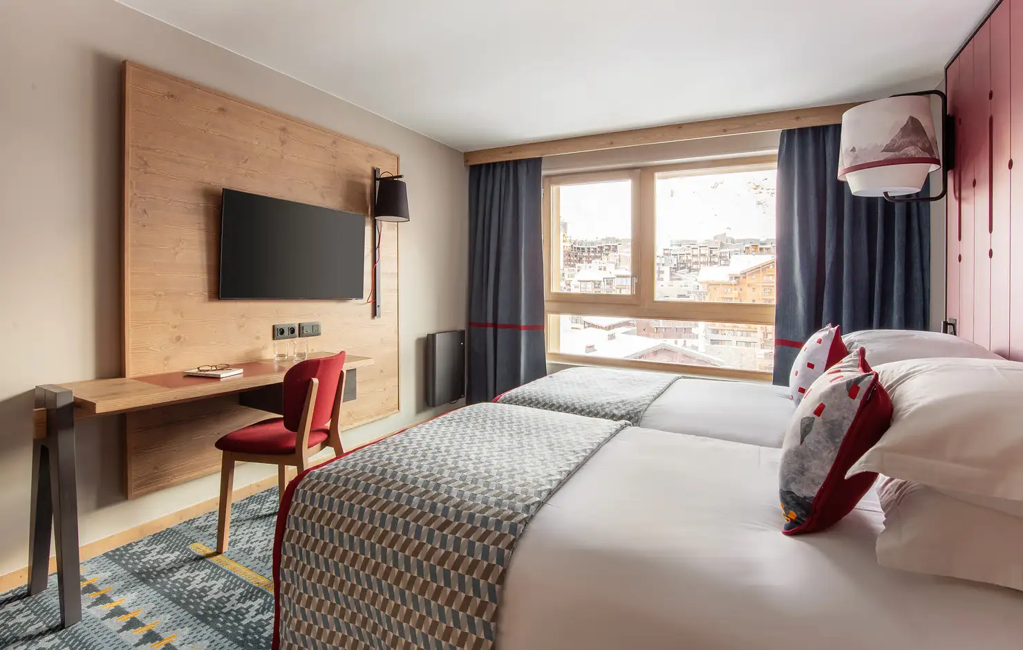 I motivi geometrici, il legno e i colori rendono la stanza uno spazio moderno e accogliente.