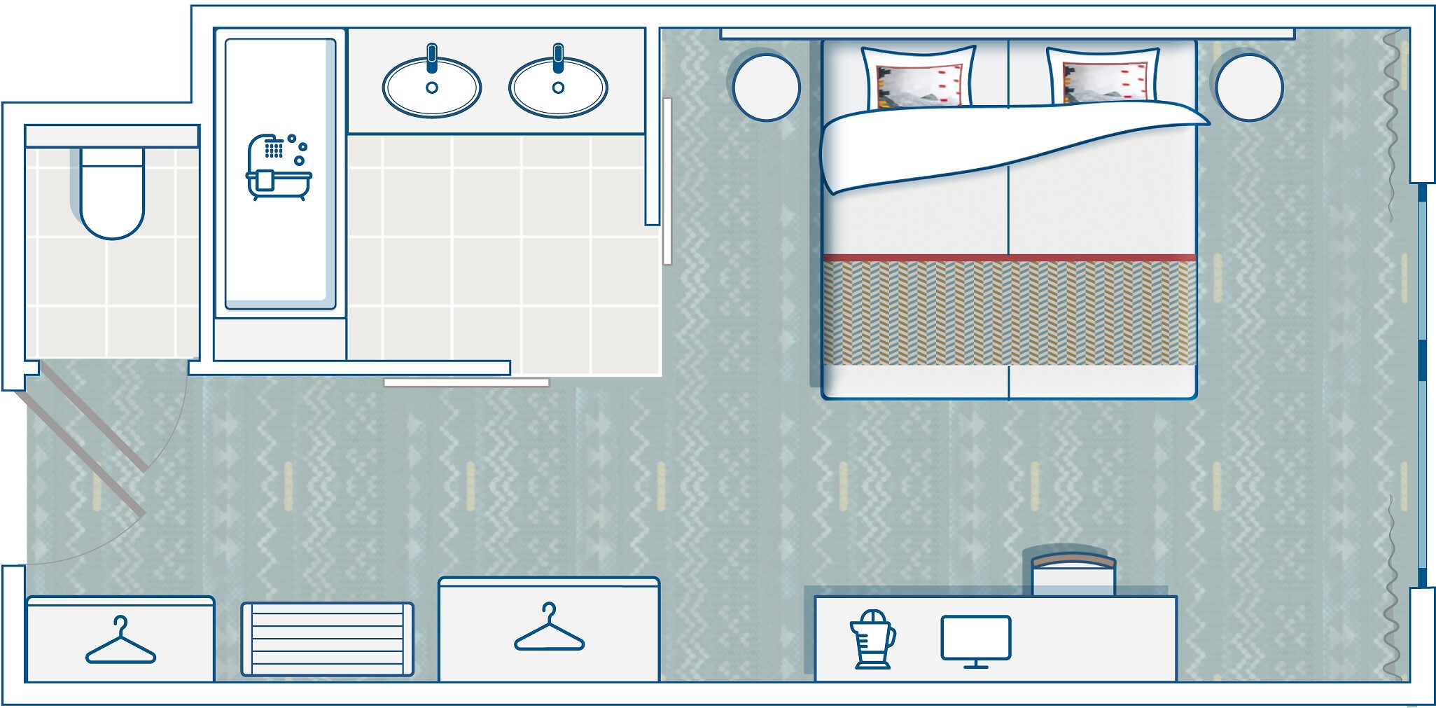 I motivi geometrici, il legno e i colori rendono la stanza uno spazio moderno e accogliente.