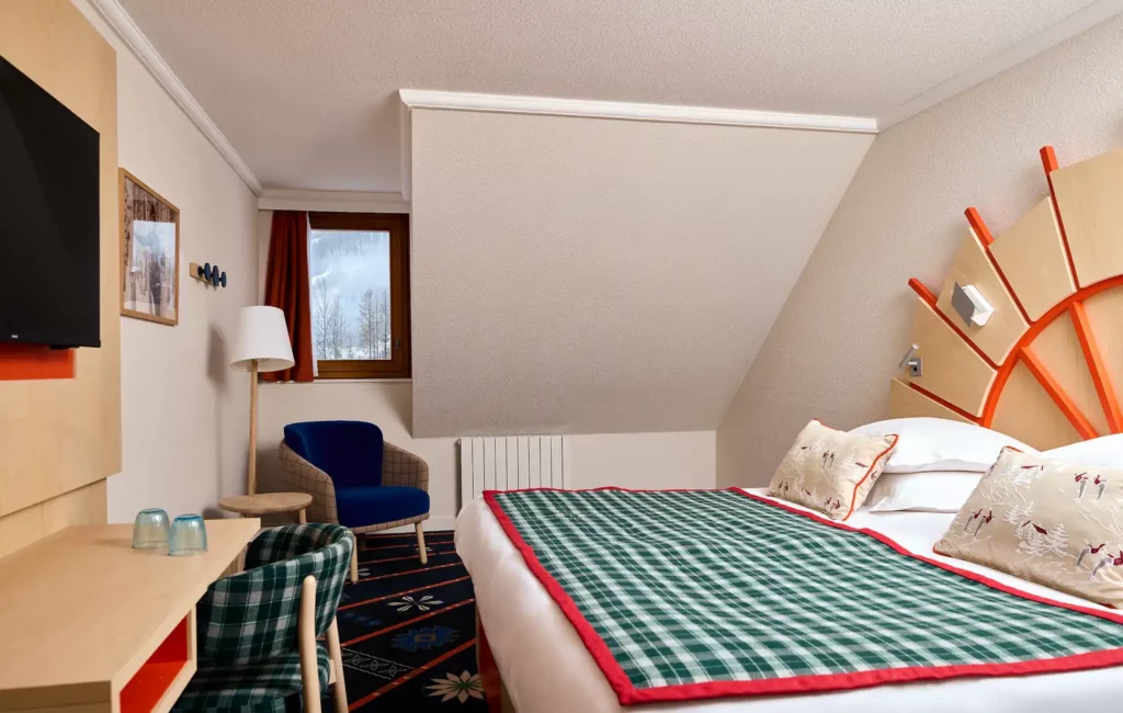Ideale per le coppie, la camera Superior è luminosa e confortevole. L'arredamento si ispira all'artigianato locale e riscalda l'atmosfera, così come il tappeto con motivi di sculture in legno del Queyras.