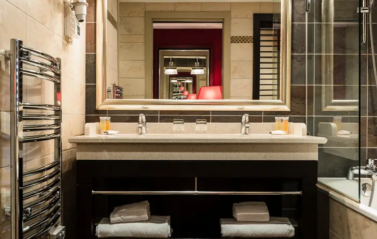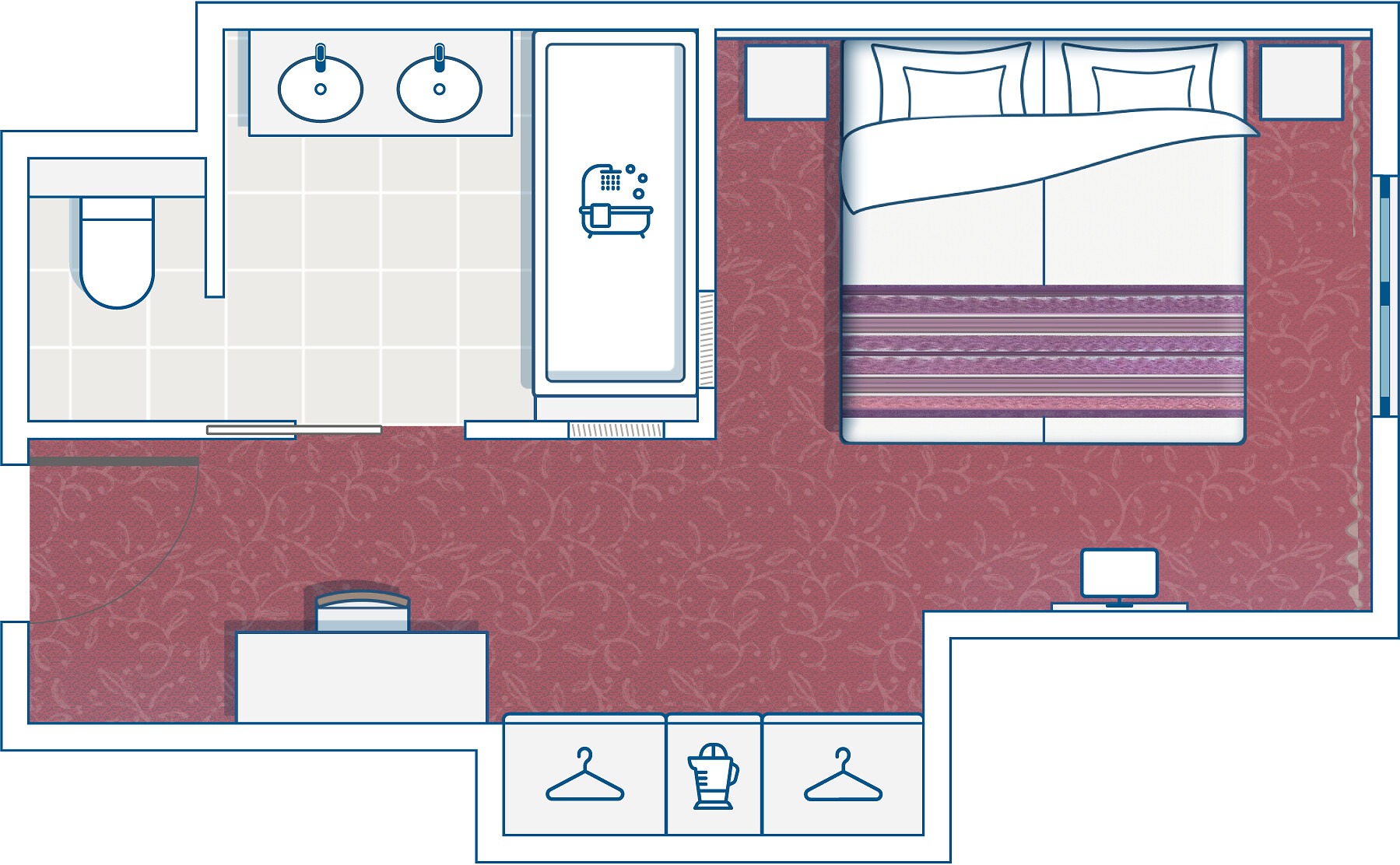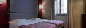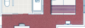 Questa camera, adatta a 2 persone, è dipinta in sfumature di rosso e porpora per dare intimità all’ambiente. Grande attenzione è dedicata ai dettagli, specie all’illuminazione e ai materiali usati.