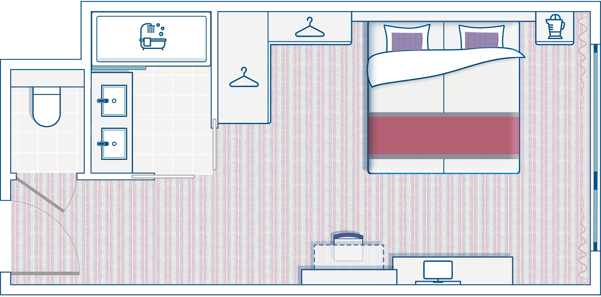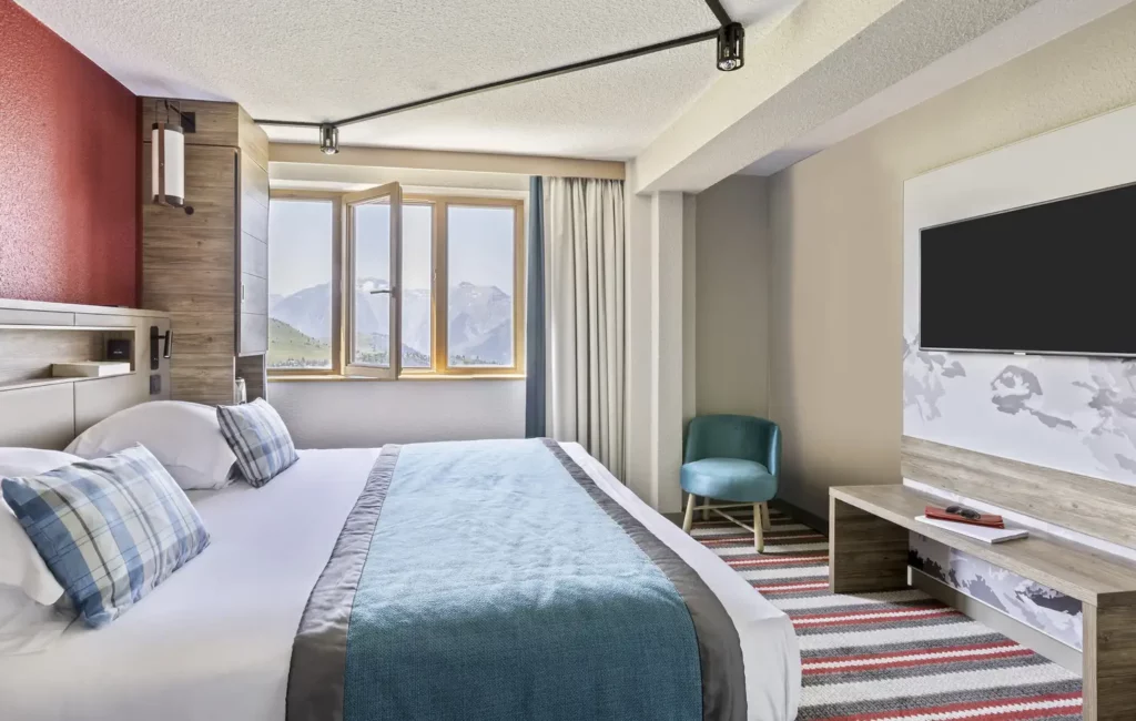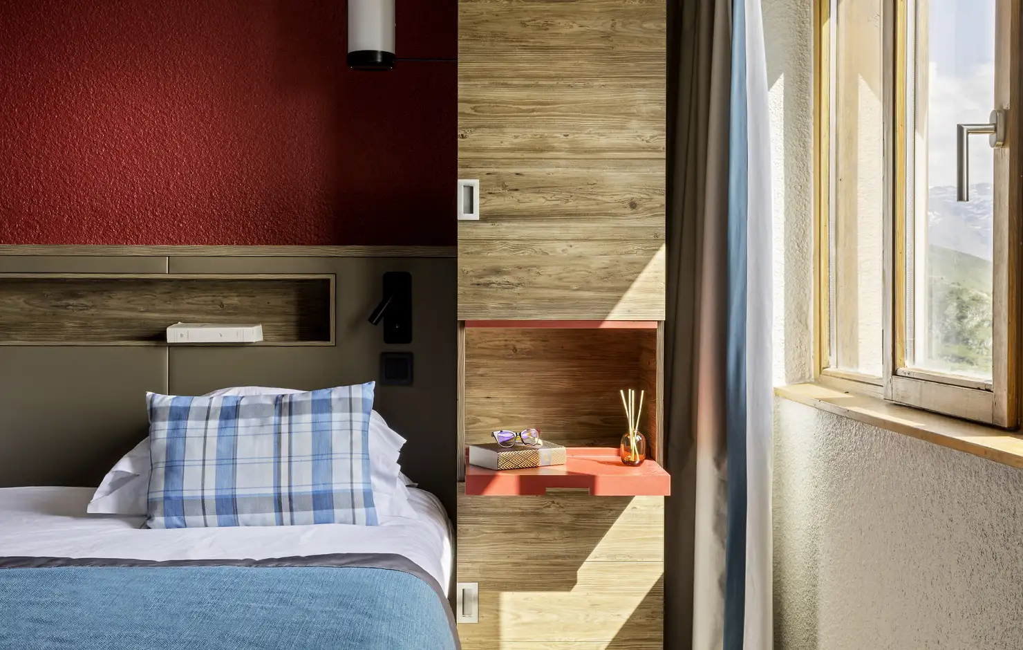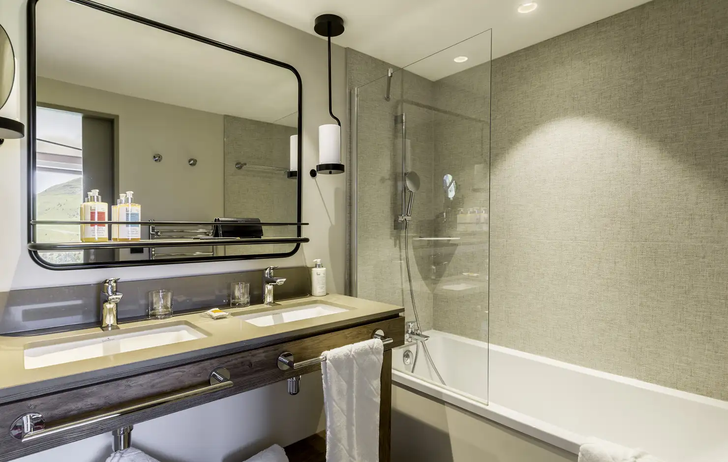 Camere confortevoli e pratiche dai colori delicati, con moltissimo spazio. Il design alpino e l'uso del legno creano un'atmosfera di montagna. Il bagno ha una vasca, ideale per rilassarsi dopo una giornata all'aria aperta.
