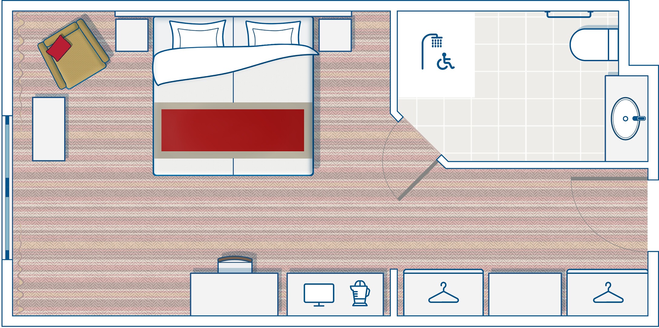 Camere realmente riposanti, grazie all'abbinamento di tinte sul rosso e il grigio e mobili eleganti. Le camere sono tutte attrezzate per favorire il soggiorno a persone con mobilità ridotta.