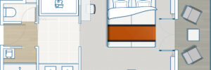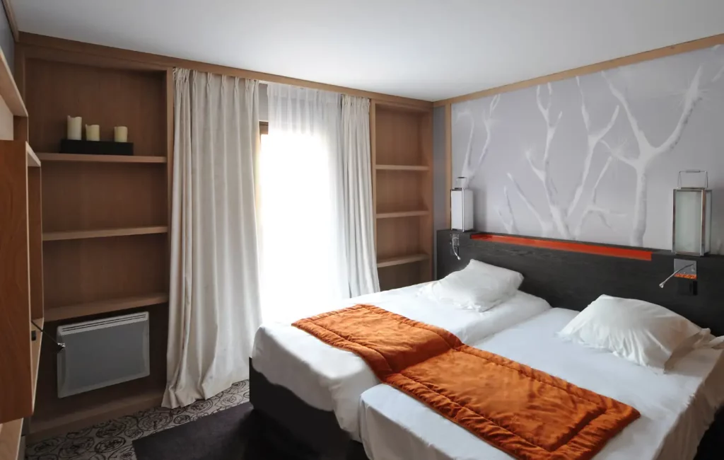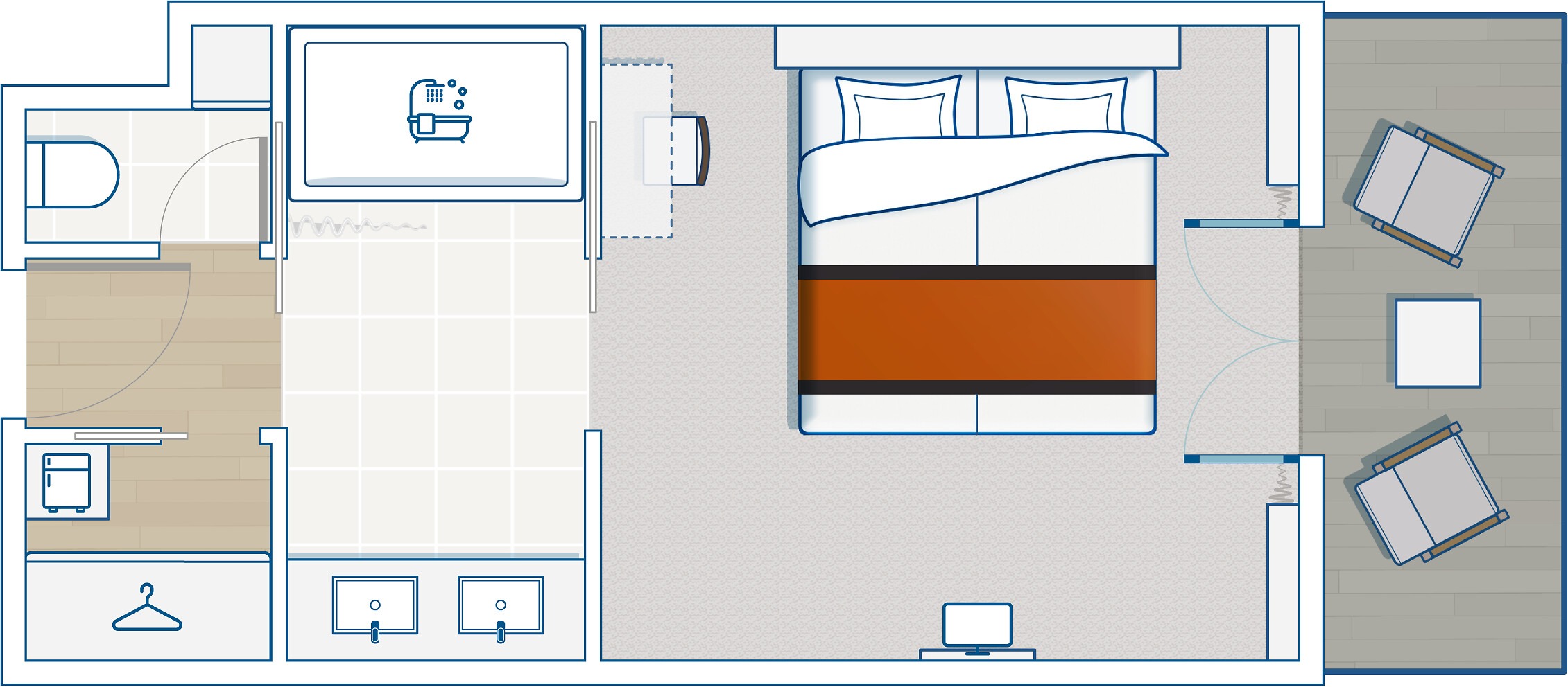 Esci dalla tua camera sul balcone e goditi l'aria fresca. Le tonalità di rosso e grigio e le linee slanciate dei mobili creano uno spazio living elegante.