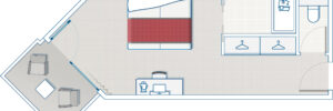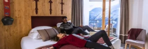 Il legno, la stella alpina sul pavimento e il la lampada da comodino a forma di campana conferiscono a questa stanza un'atmosfera incantevole. La camera è spaziosa e arredata in modo attraente e si apre su un balcone arredato.