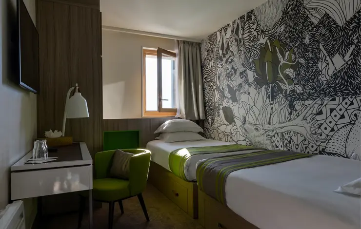 Questa camera è perfetta per le famiglie giovani. È molto spaziosa, ha due zone notte separate e il balcone. L’atmosfera è resa più dolce dall’uso di anice verde e da spruzzi floreali.