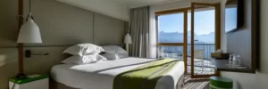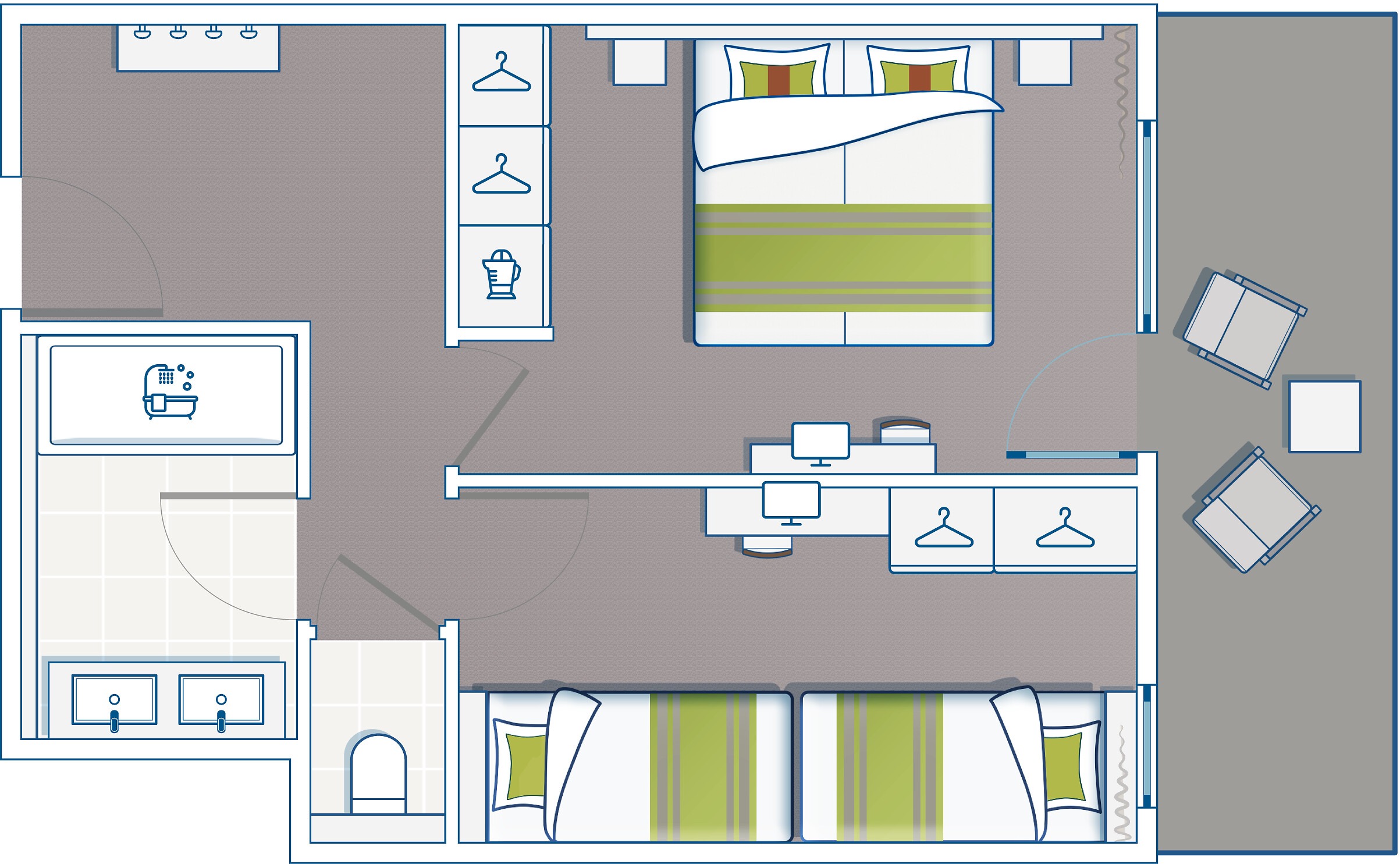 Questa camera è perfetta per le famiglie giovani. È molto spaziosa, ha due zone notte separate e il balcone. L’atmosfera è resa più dolce dall’uso di anice verde e da spruzzi floreali.