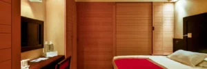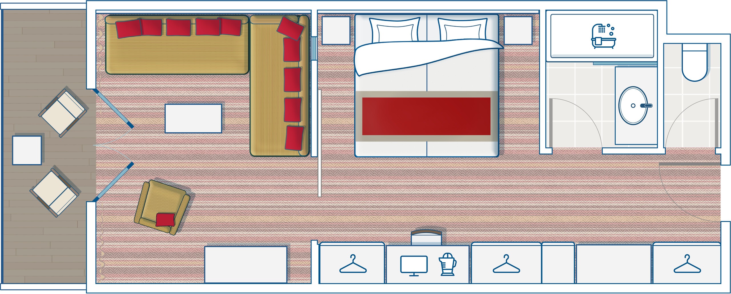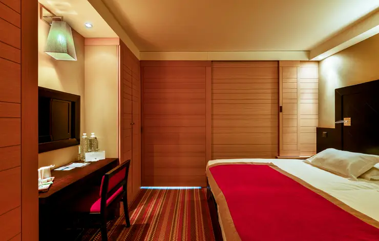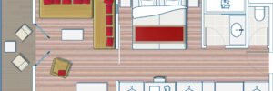 Disponibile dall'estate 2023. Perfetta per le famiglie, questa camera è progettata con 2 diverse zone notte separate da una porta scorrevole. Ognuno può avere la propria privacy. Accoccolatevi insieme in questa sistemazione accogliente dai toni rossi.