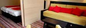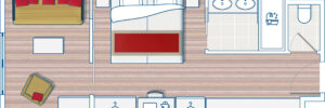 Camera accogliente e moderna, grazie al sapiente accostamento dei rossi e dei grigi della tinteggiature all'elegante mobilio. Il salottino, diviso da una porta scorrevole, può diventare la zona letto per un bambino.
