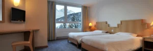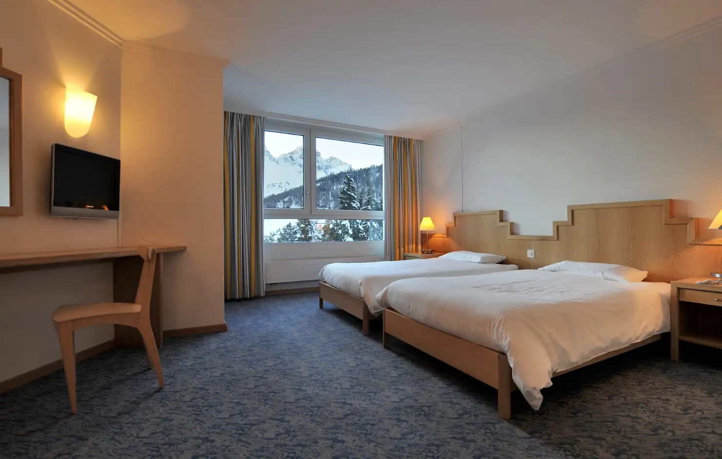 Una delle cose migliori di una vacanza in montagna è la vista delle catene montuose della Svizzera. Questa camera per 2 persone è luminosa, ariosa e arredata con eleganti mobili in legno.