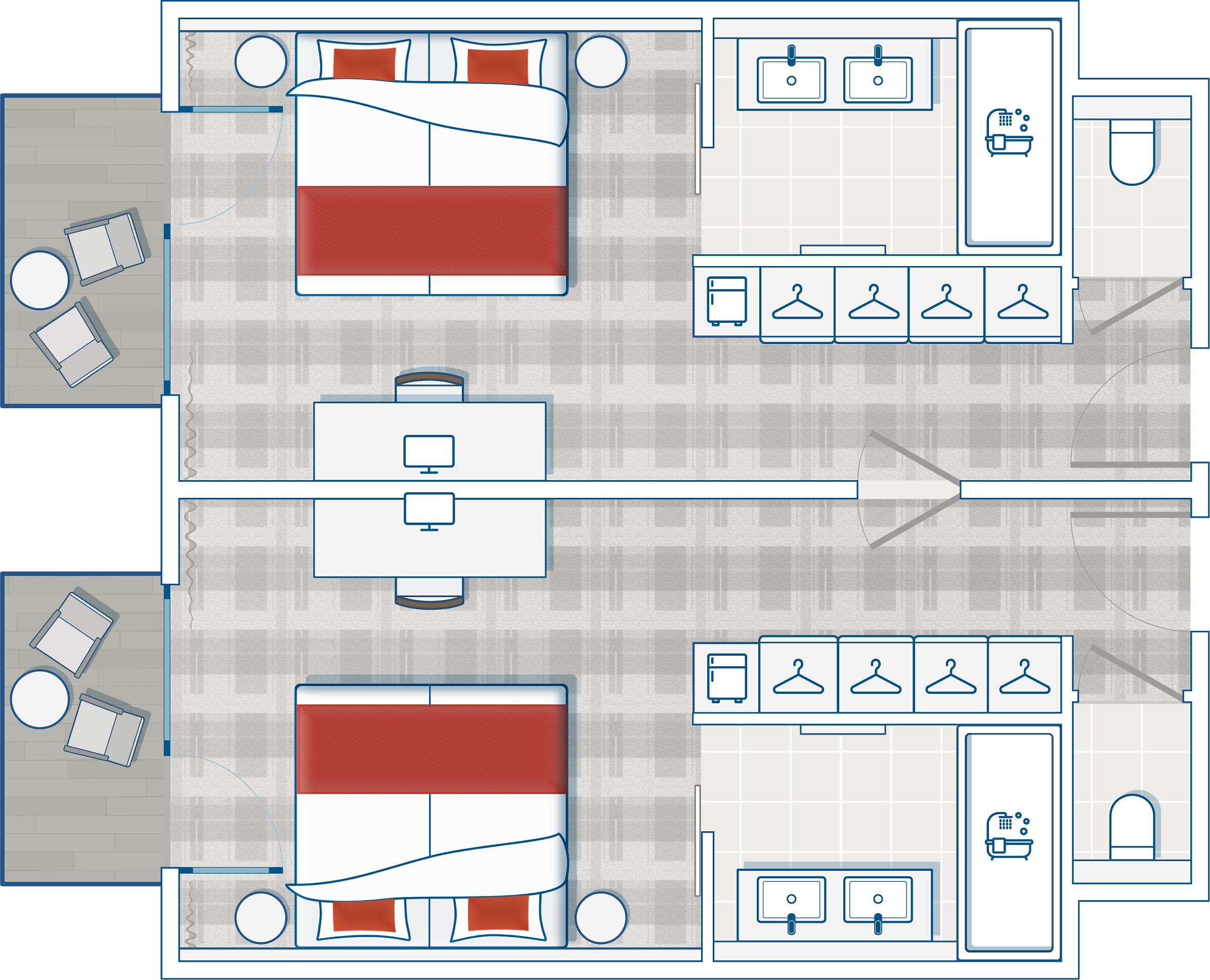 Questa disposizione è molto adatta a famiglie e gruppi numerosi in cerca di spazio e comfort. Le camere dall'atmosfera accogliente, i balconi, i bagni... tutto è pensato per il relax.