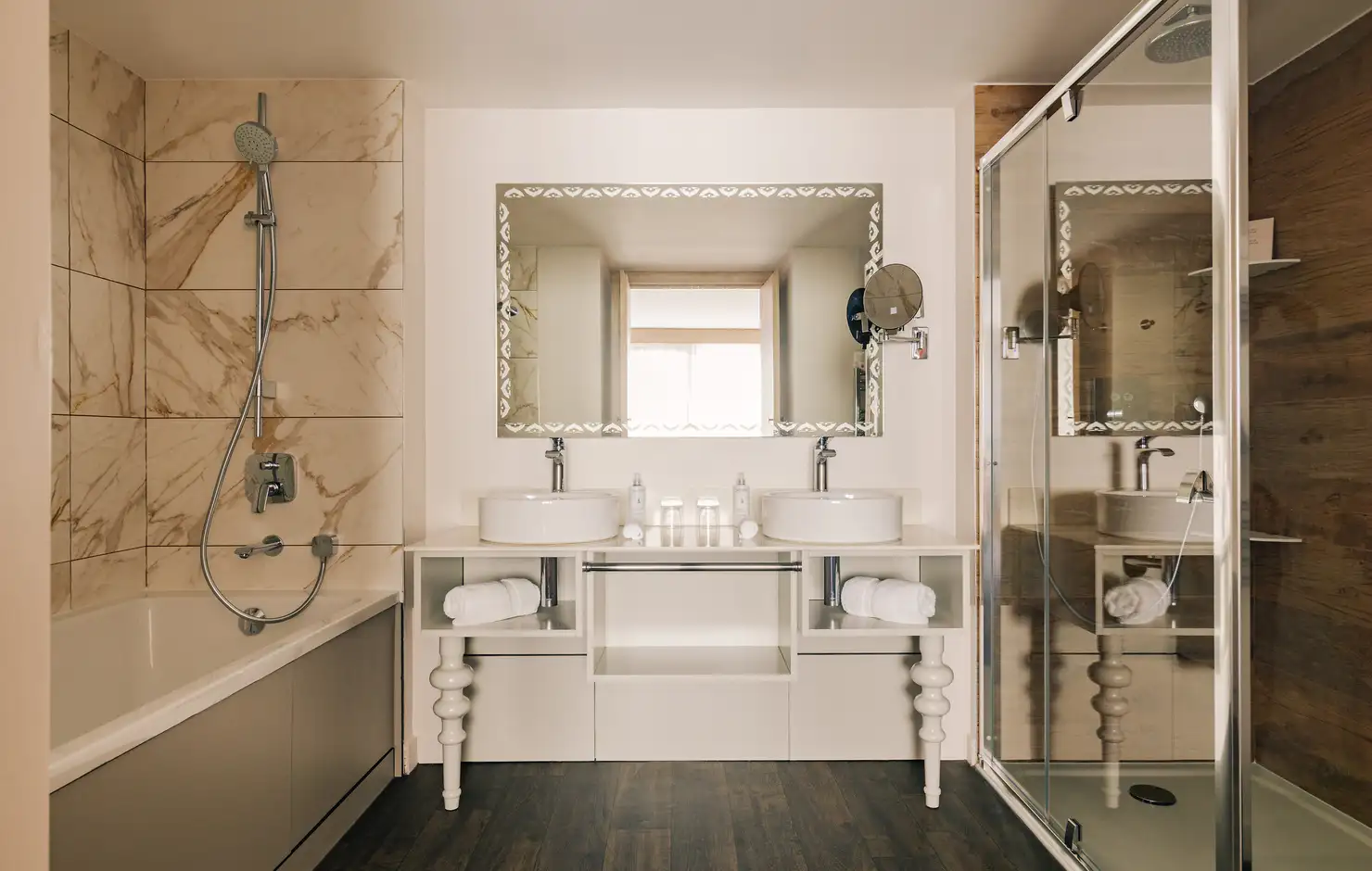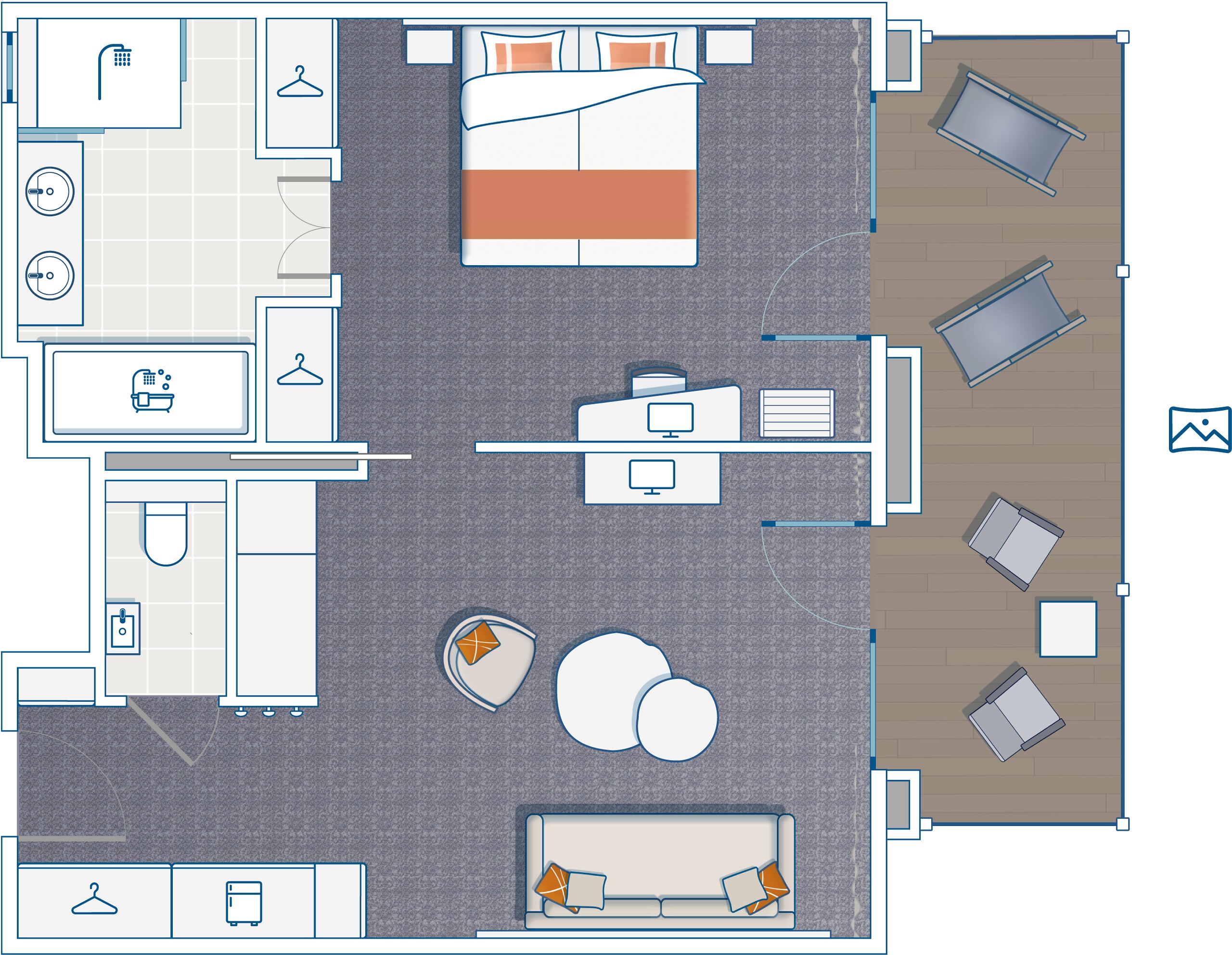 L'atmosfera accogliente di questa Suite con vista unisce il comfort moderno alla decorazione tradizionale valdostana. Godetevi la spettacolare vista sulla valle Tarentaise dal balcone. La spaziosa Suite è composta da una camera da letto e da un soggiorno con bagno e cabina armadio.