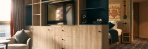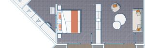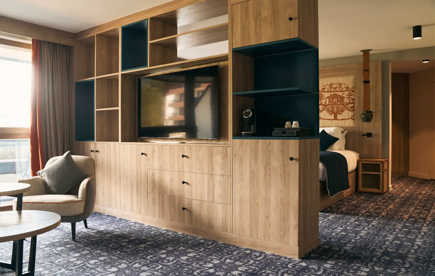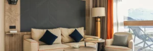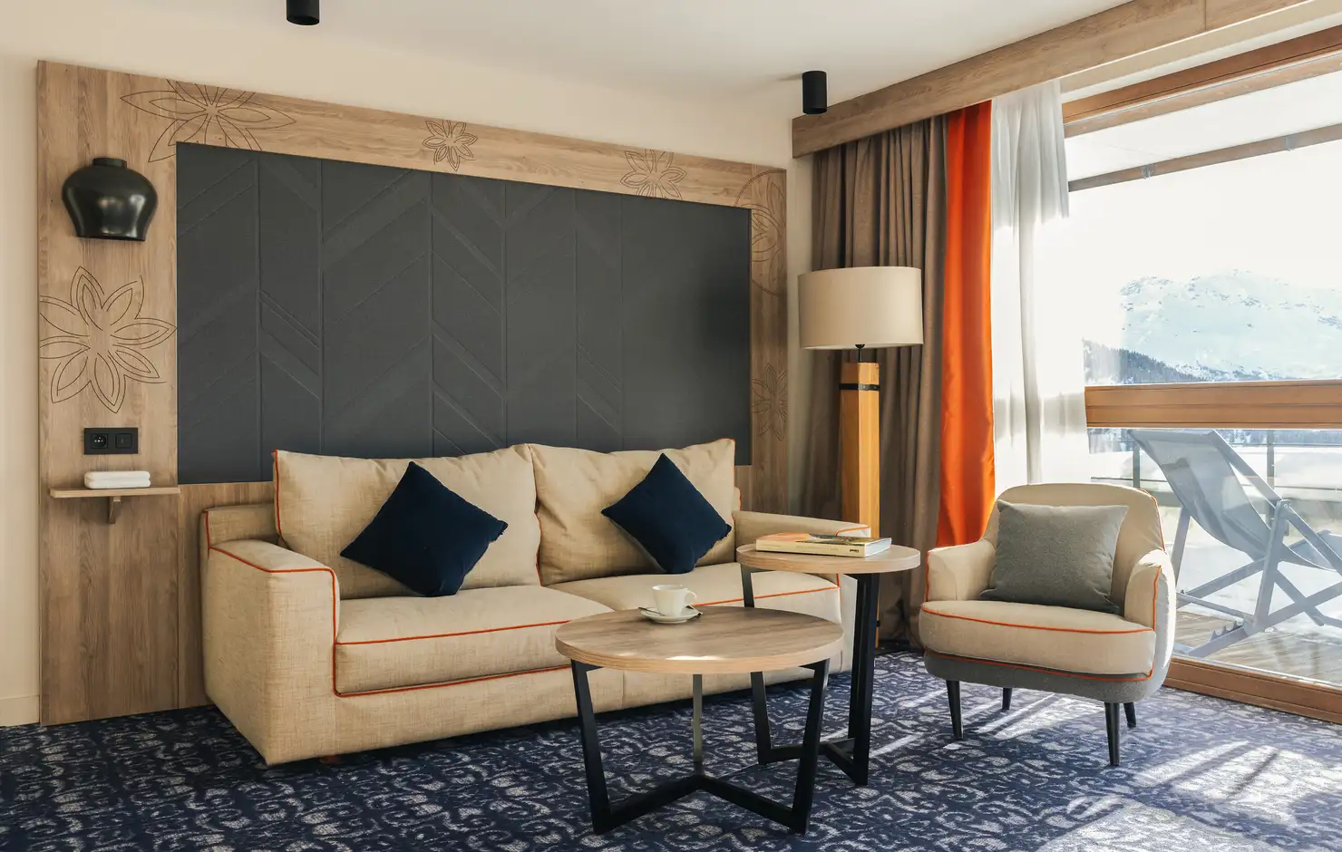 Lo spazio generoso della Suite è particolarmente adatto alle persone con mobilità ridotta. La decorazione dello spazio è moderna e calda, in omaggio alla tradizione valdostana. Il balcone arredato, la camera da letto e il soggiorno sono perfettamente collegati.
