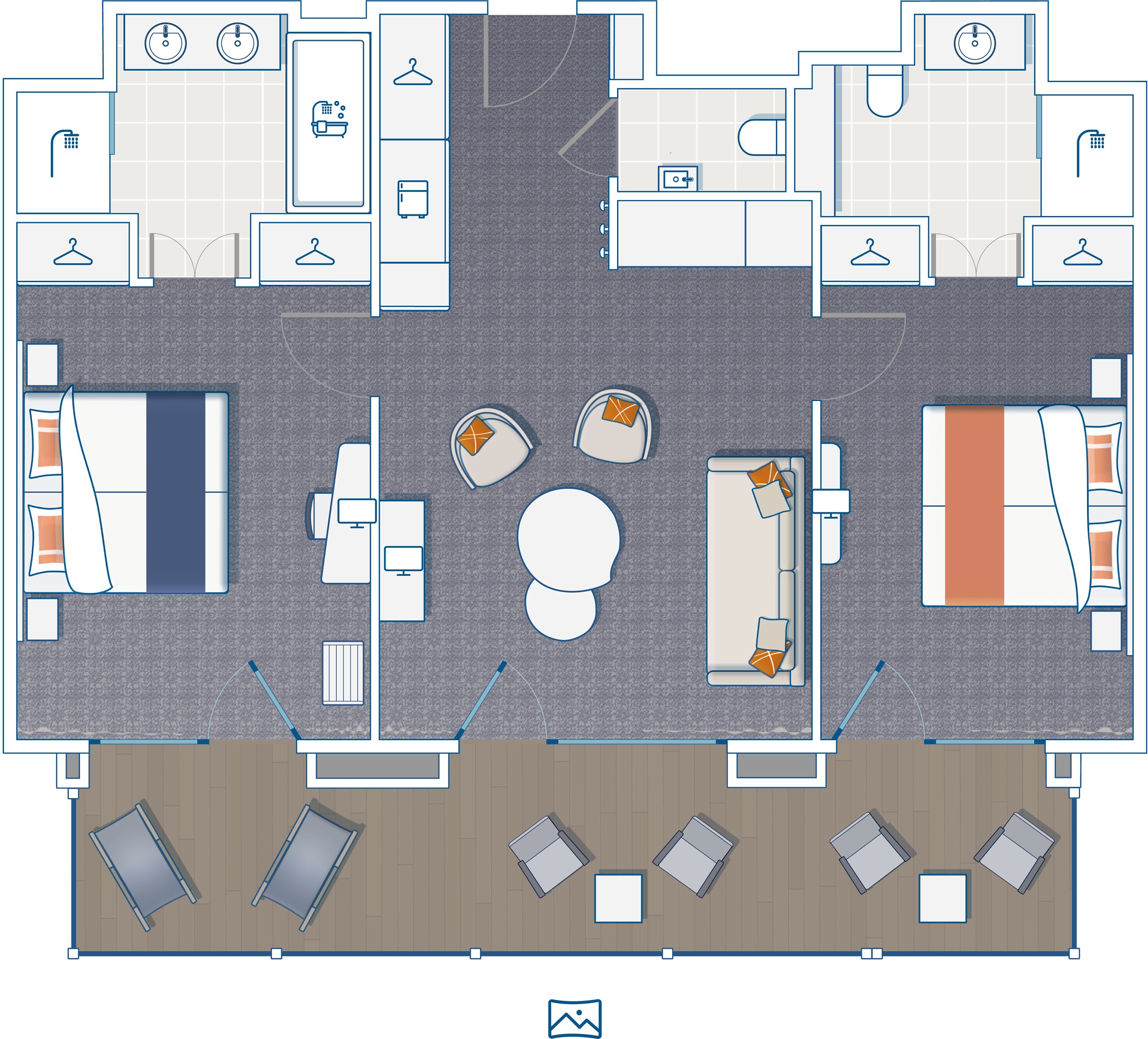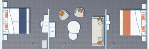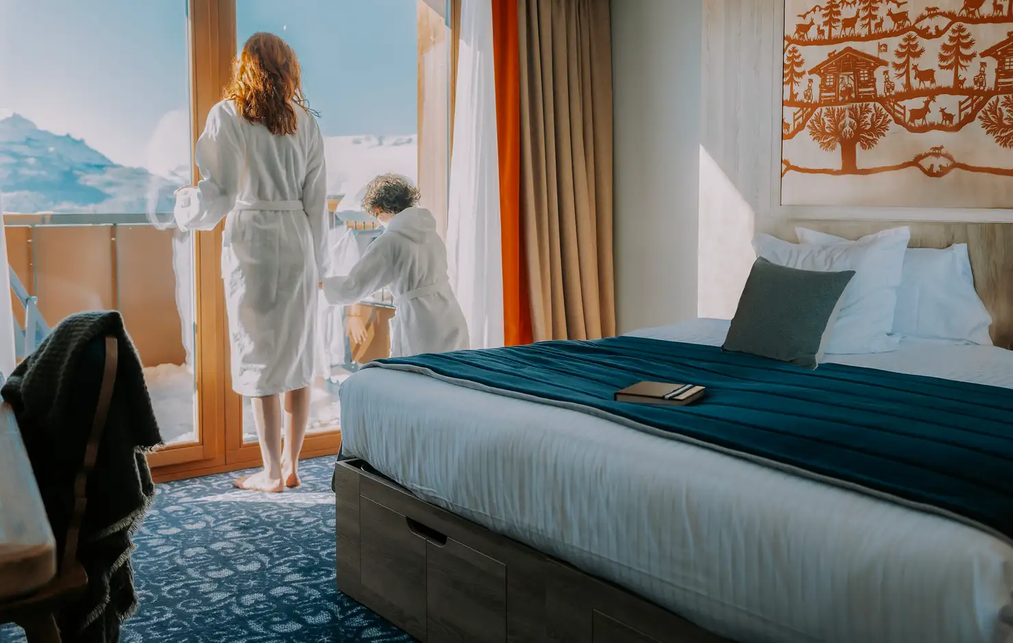 Il balcone con vista eccezionale sulla valle della Tarentaise è la caratteristica principale di questa Junior Suite. Con 2 camere da letto, un soggiorno e 2 bagni, lo spazio generoso emana un'atmosfera accogliente che unisce tradizione e modernità.