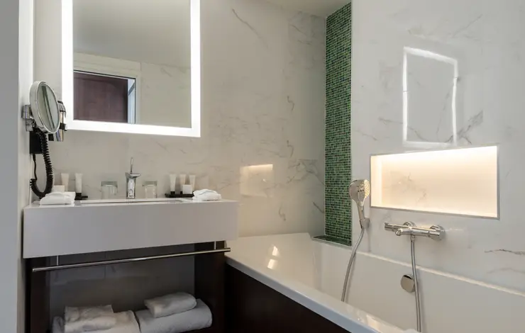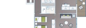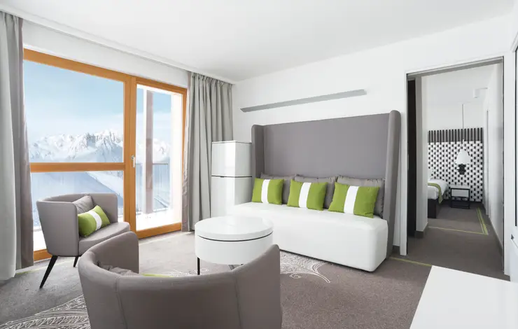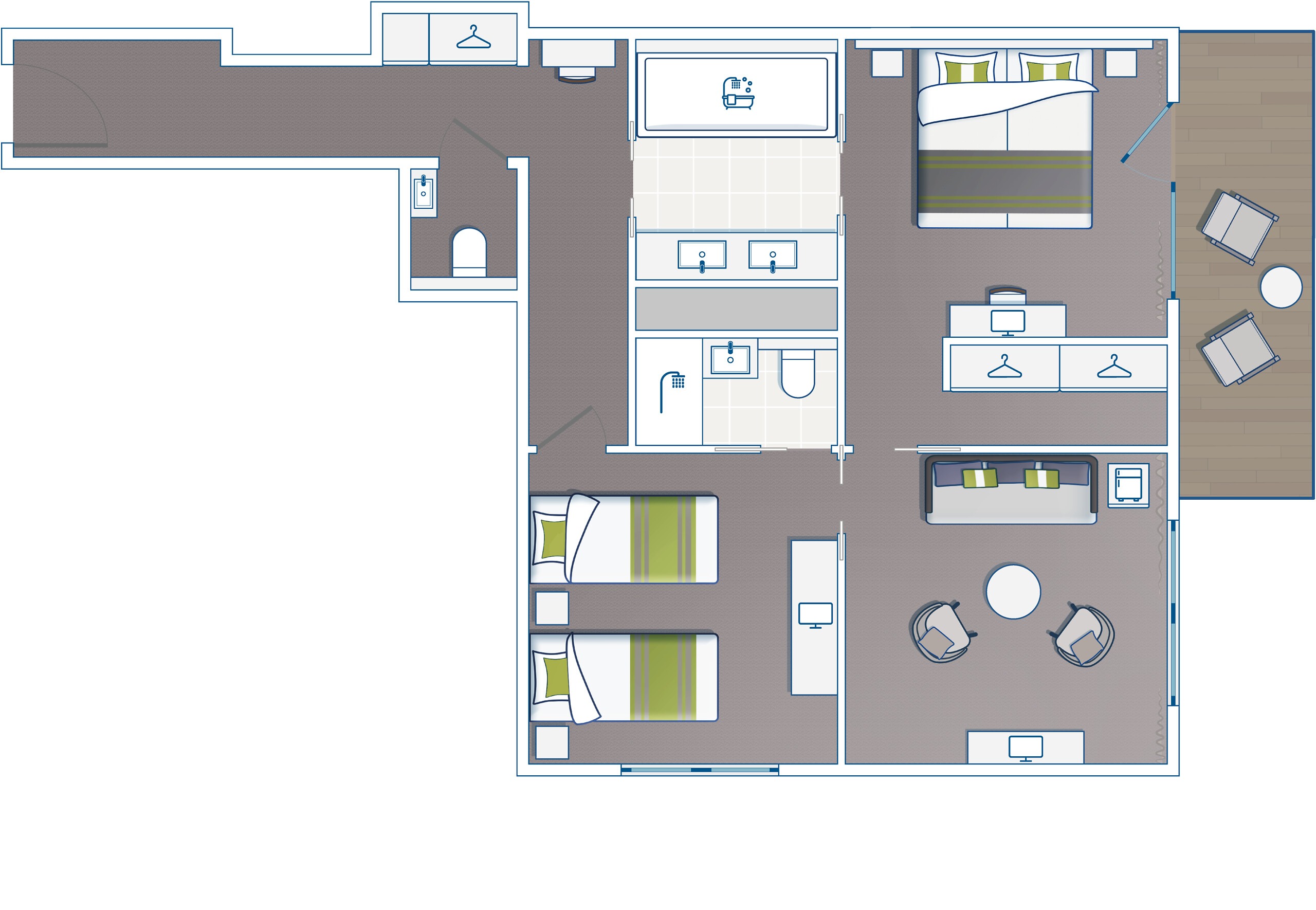 Per le famiglie amanti del design e del comfort. Questa Suite ha due camere da letto, il soggiorno e il balcone. L’interno si ispira alla natura, specie per i colori e i materiali utilizzati.