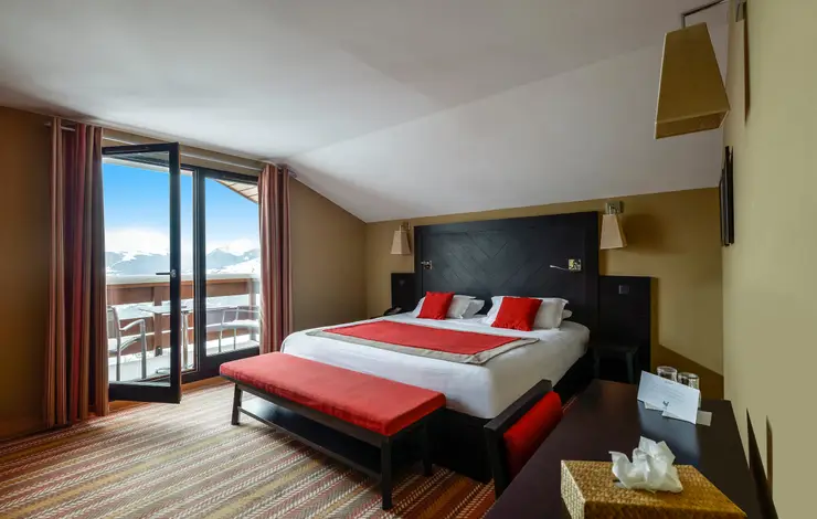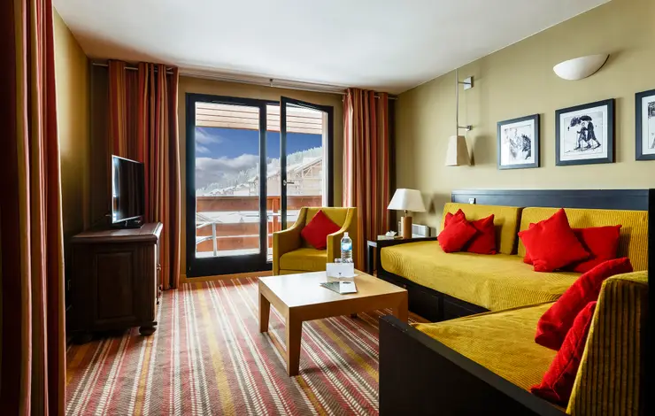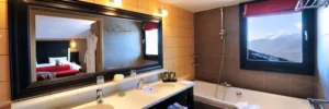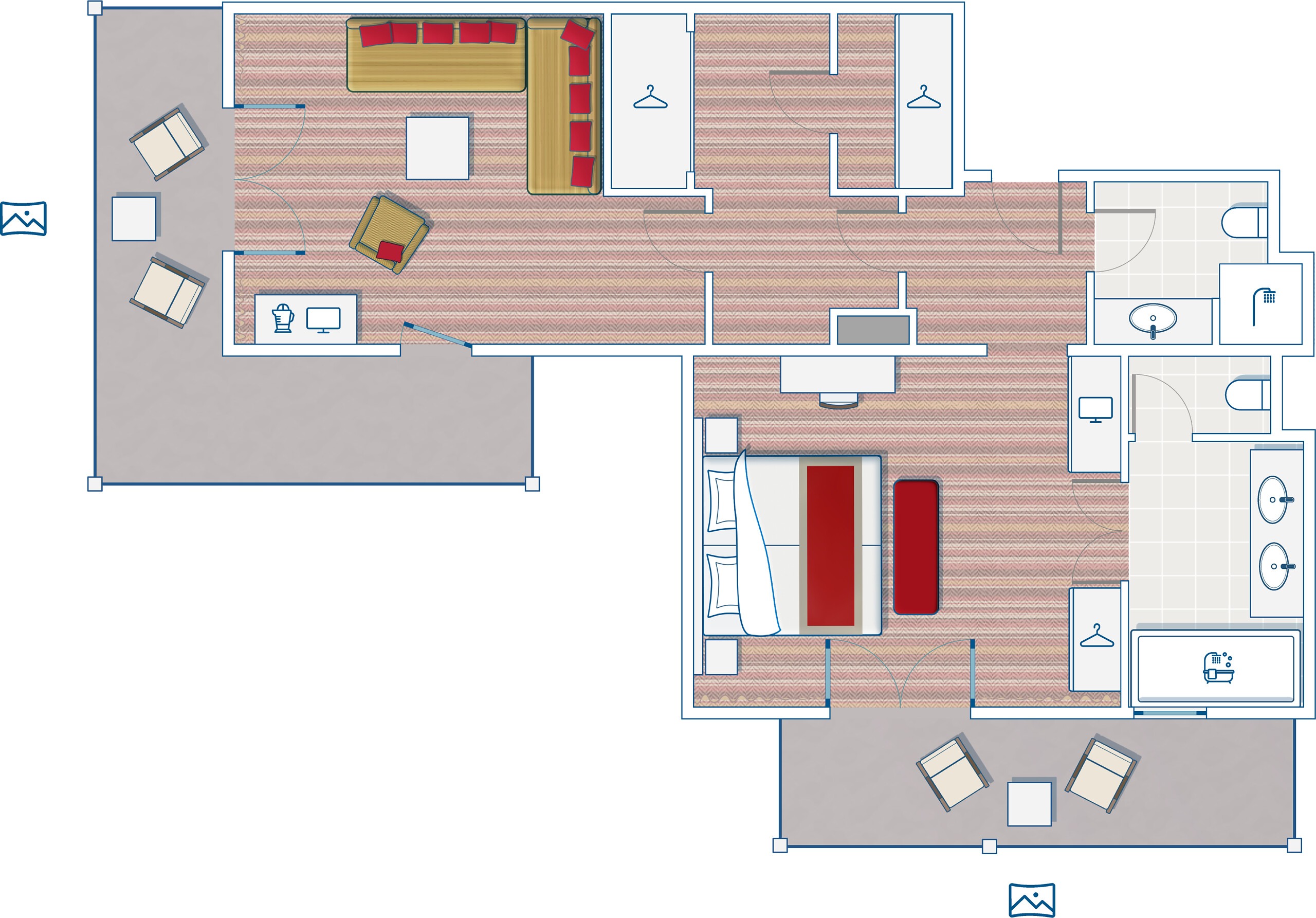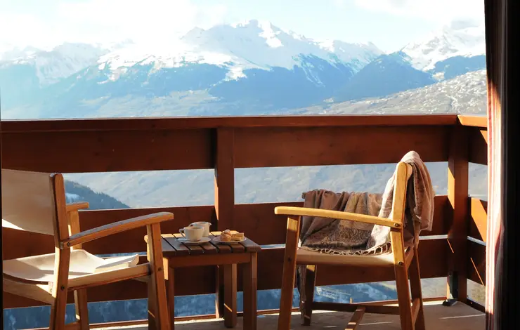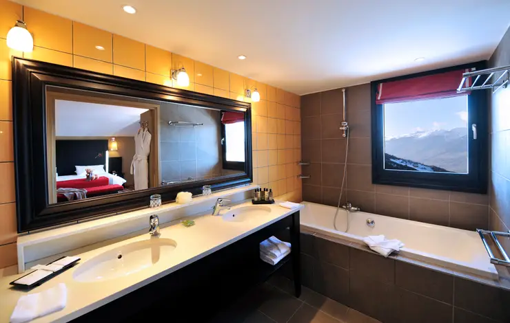 Dal lettino prendisole della terrazza si gode una splendida vista delle montagne. All'interno, il soggiorno, la cabina armadio e il bagno, completi di doccia e vasca, rendono questa Suite davvero eccezionale.