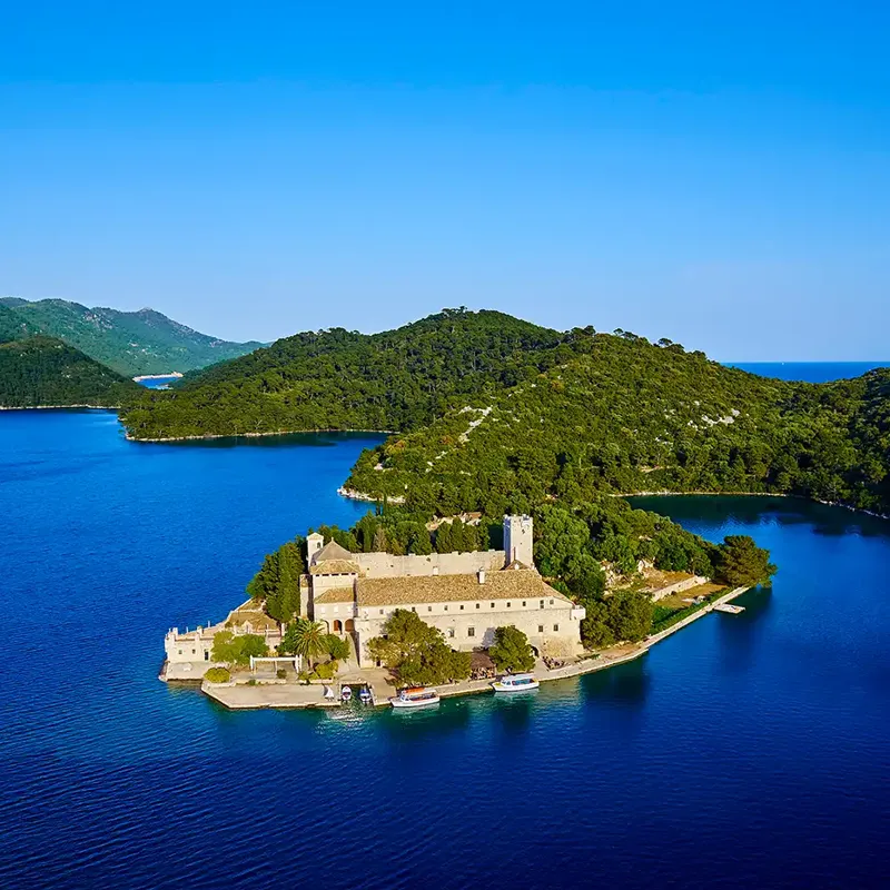 - Giorno 7 - Venerdì MLJET / MONASTERO E LAGHI (1/2 giorno, Mattina)*: Fate una gita in barca attraverso il Parco Nazionale di Mljet, famoso per i suoi due laghi salati e il monastero benedettino del XII secolo costruito su un’isola in mezzo al grande lago. Dopo aver visitato il monastero, potete fare una passeggiata intorno all’isola o nuotare nell’incantevole lago salato.