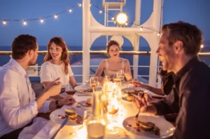 Poter ammirare la notte stellata dal mare è uno degli spettacoli più belli in assoluto. A bordo questo piacere si gusta in vari modi. Uno delle più belle occasioni di avere la testa tra le stelle, il cocktail del Capitano con tramonto sullo sfondo. Un altro appuntamento inaspettato: la serata di carnevale con maschere e costumi.