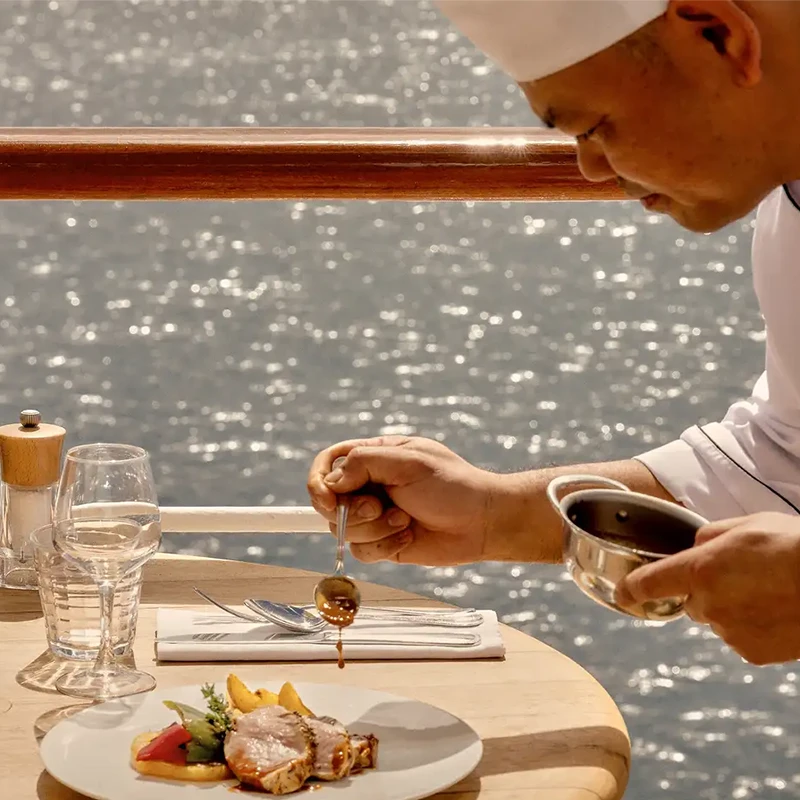 - Colazione, pranzo e cena serviti in cabina (eccetto per gli ospiti in suite per i quali la colazione in cabina è compresa)
